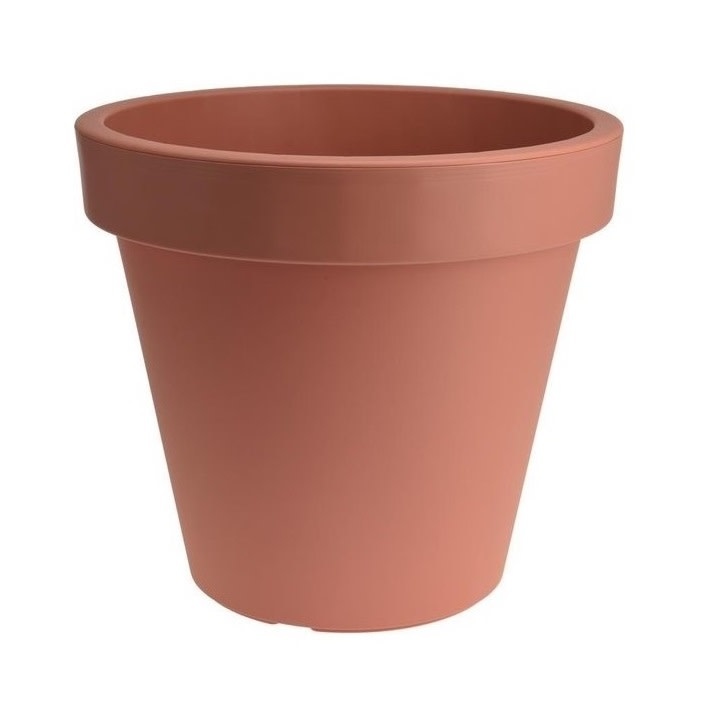 Moderne kunststof bloempot met aan de bovenzijde een diameter van circa 60 cm. Kleur terracotta