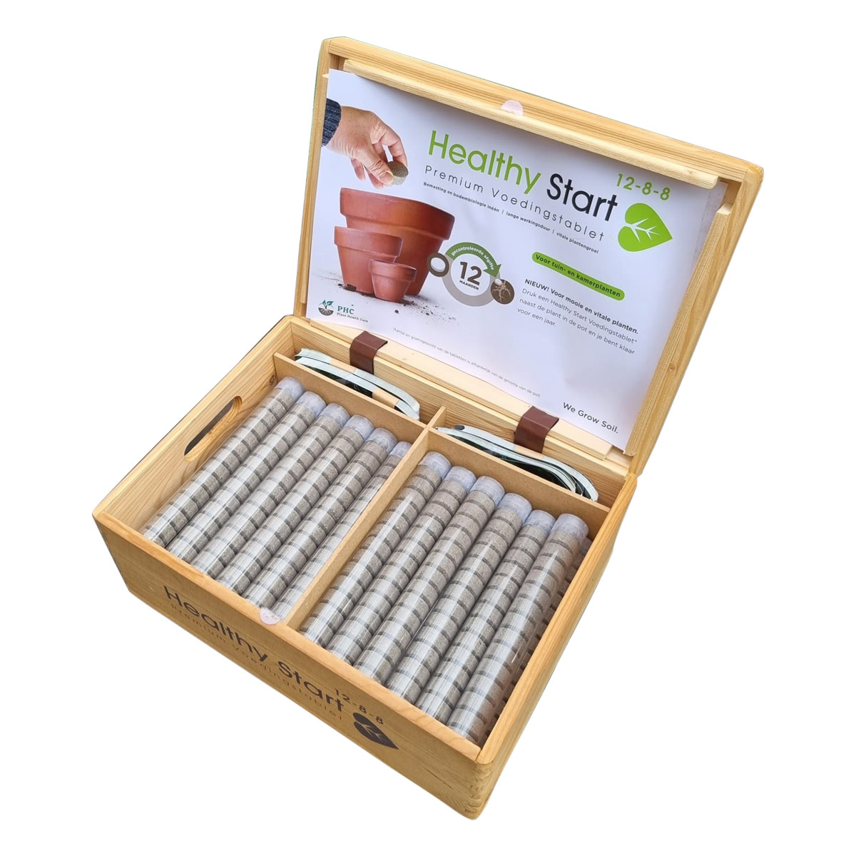 Brabantpalm Healthy Start tabletten bevatten zowel macro als micro-elementen voor een gezonde plantengroei. De gedoseerde vrijgave hiervan zorgt dat de plant structureel van een gebalanceerde hoeveelheid voeding wordt voorzien. De toegevoegde microbiologie zorgt voor fixatie van stikstof, vrijmaken van o.a. mineralen, verhogen van chlorofylgehalte en afbraak van organische materialen. De fulvine in de tabletten zorgt voor het mobiliseren van elementen naar de plant en het stabiliseren van celmembranen.