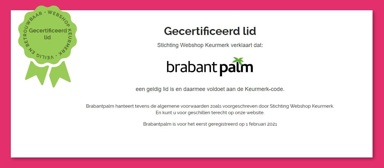 Brabantpalm mag vanaf 01-02 2021 het Webshop Keurmerk logo voeren. Dit houdt in dat wij als webshop voldoen aan alle wettelijke verplichtingen die dit keurmerk stelt aan haar leden en dat wij hierop getoetst worden. Hieronder enkele voordelen voor u als consument: