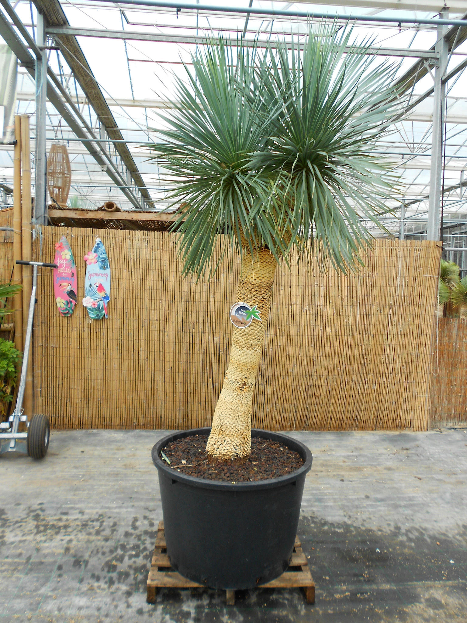 Yucca Rostrata Monsterpiece met 2 koppen. Stamhoogte 160 cm / Planthoogte 240 cm / Pot 230L
